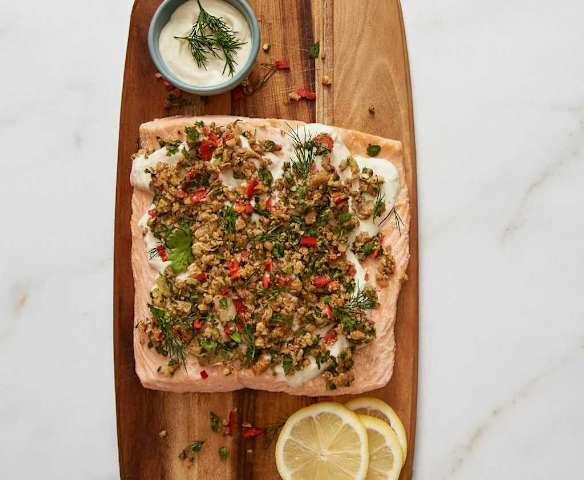 Saumon cuit à la vapeur avec sauce au yaourt et crumble aux noix